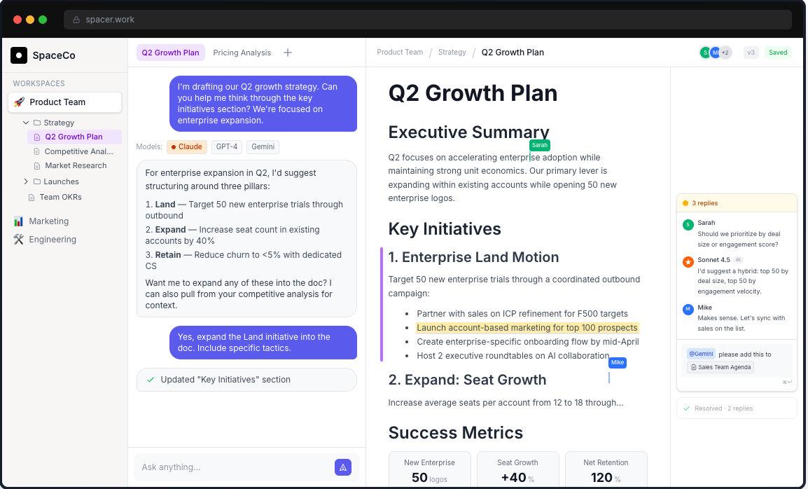 Q2 focuses on accelerating enterprise adoption while maintaining strong unit economics. Our primary lever is expanding within existing accounts while opening 50 new enterprise logos.Sarah